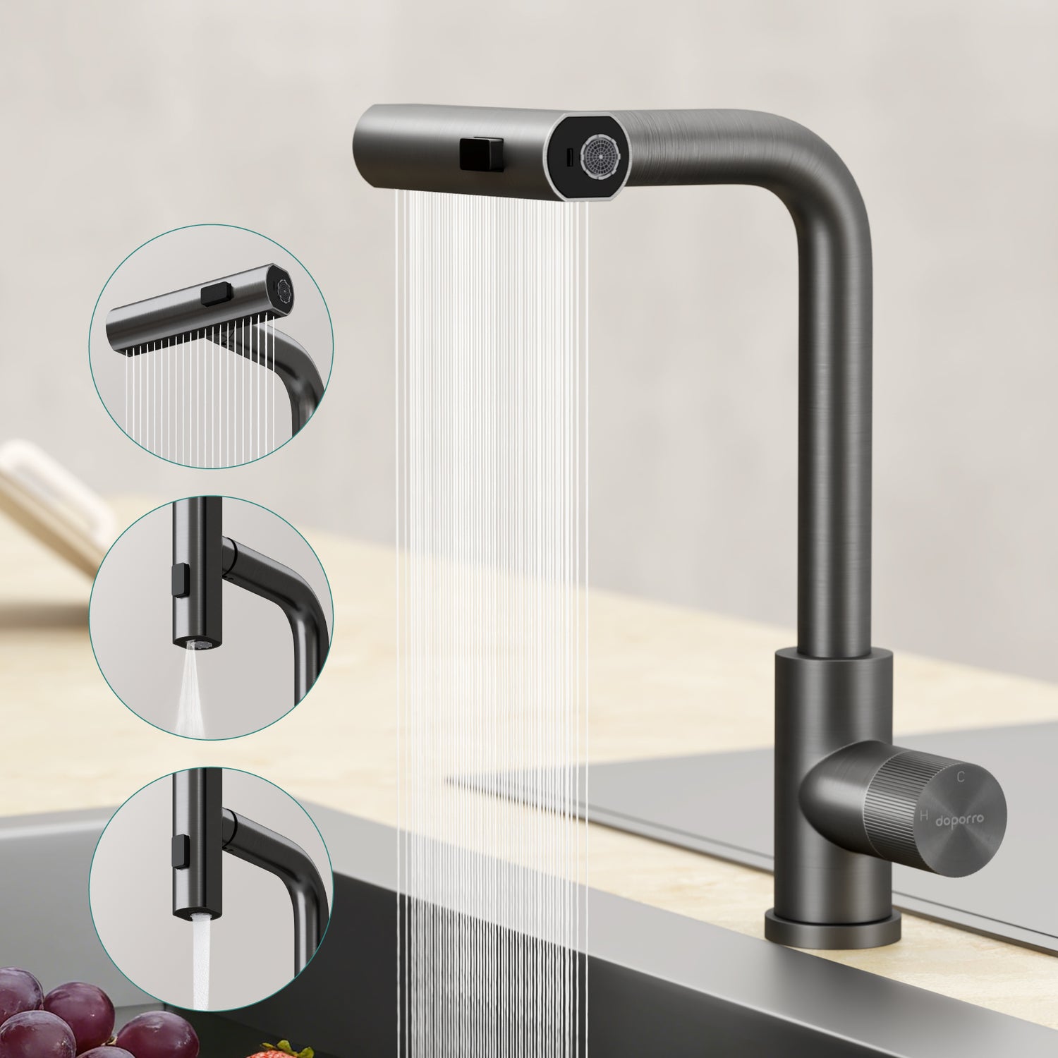 - Drei verschiedene Strahlarten: Sprühstrahl, Luftsprudler-Strahl und Regenstrahl sorgen für einen stabilen Wasserfluss und reduzieren effektiv Spritzwasser – für mehr Komfort und Sauberkeit in der Küche.