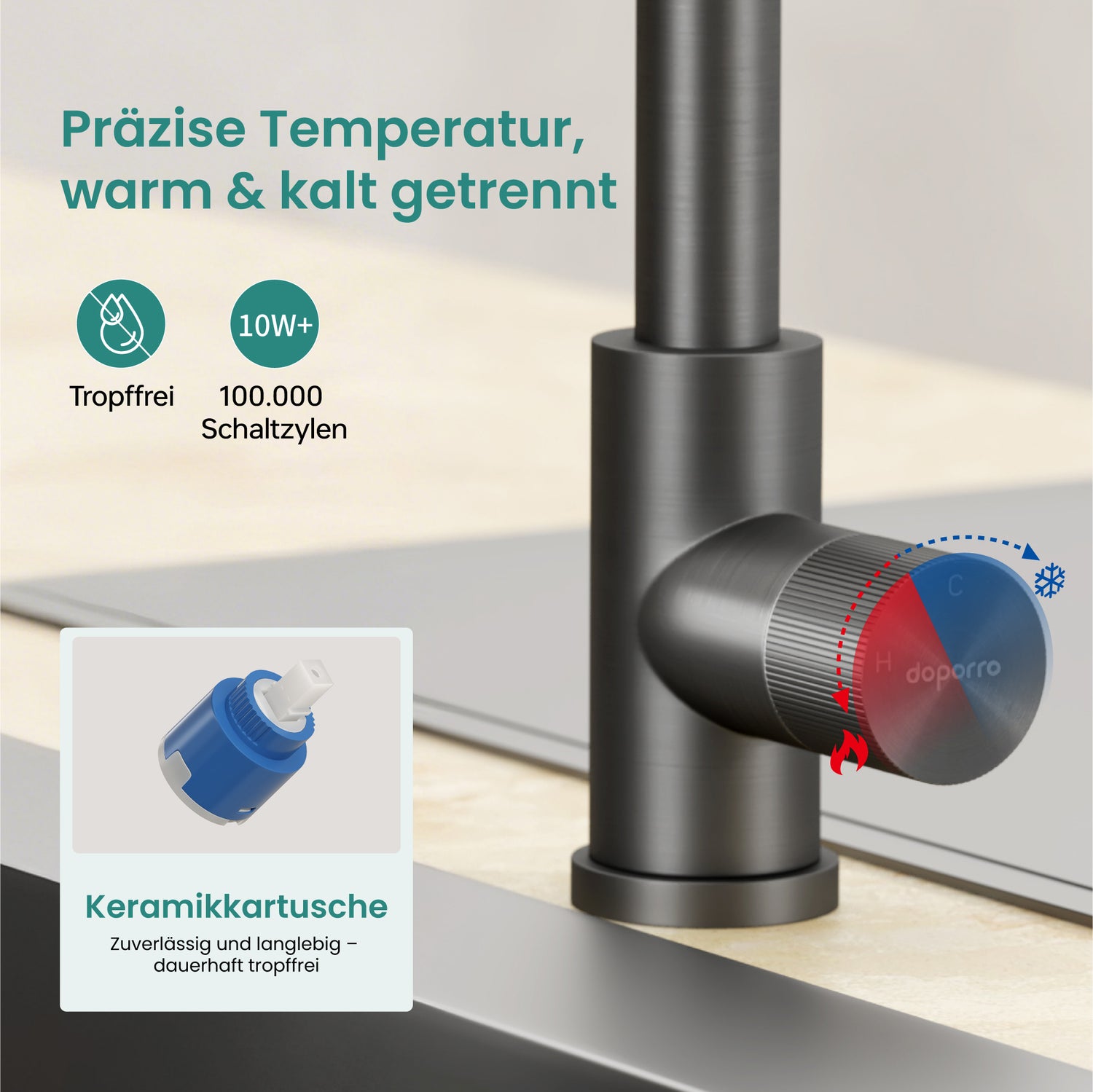 - Einhebelmischer mit Keramikkartusche: Präzise Steuerung von Warm- und Kaltwasser sowie der Wassermenge. Tropfsicher und langlebig dank hochwertiger Keramikkartusche. Ausgestattet mit einem abnehmbaren Strahlregler, der sich zur regelmäßigen Reinigung einfach entfernen lässt.