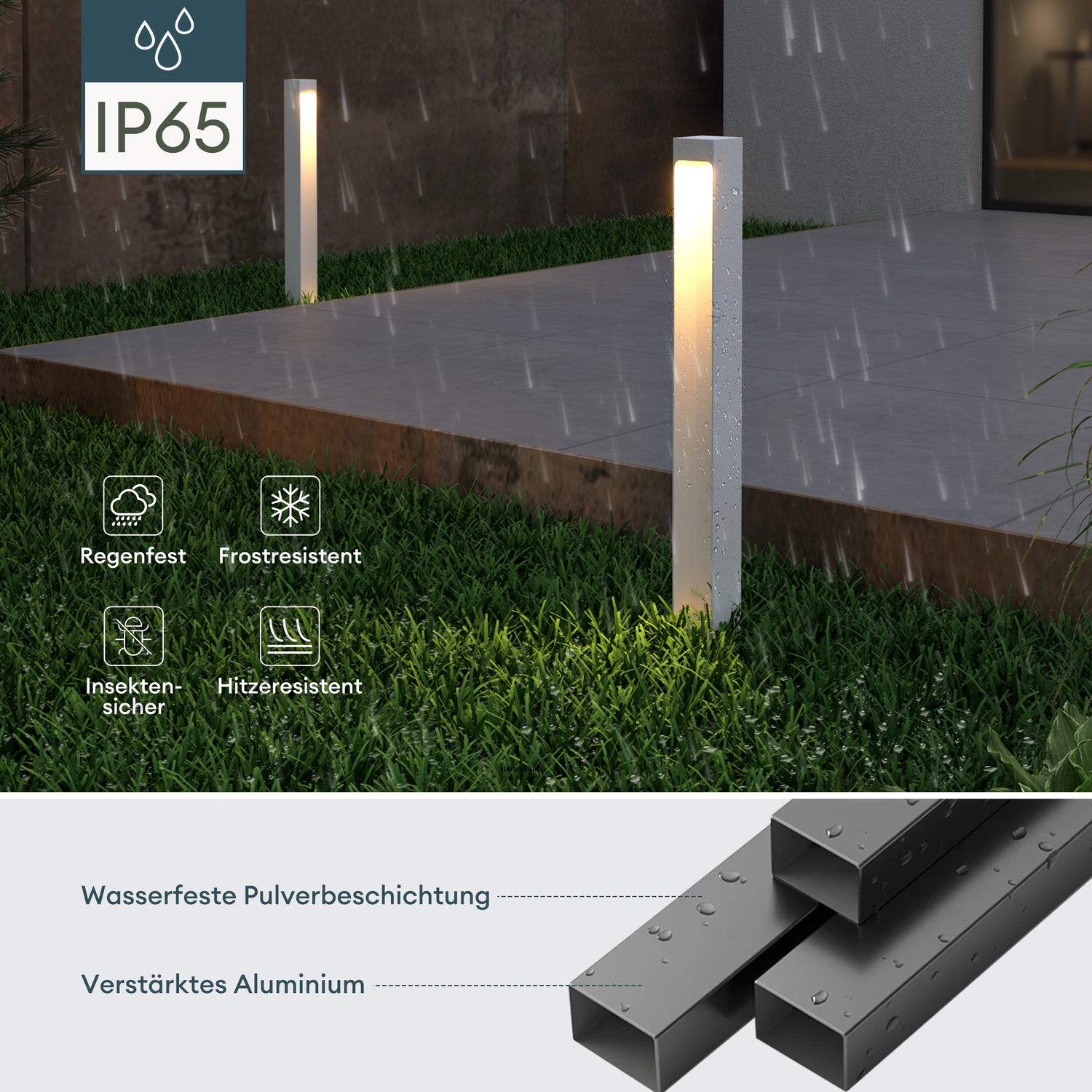 - Hochwertige Materialien: Die Außenlampen sind mit einer speziellen Pulverbeschichtung versehen. Der Aluminiumboden ist sehr rostresistent und stabil.