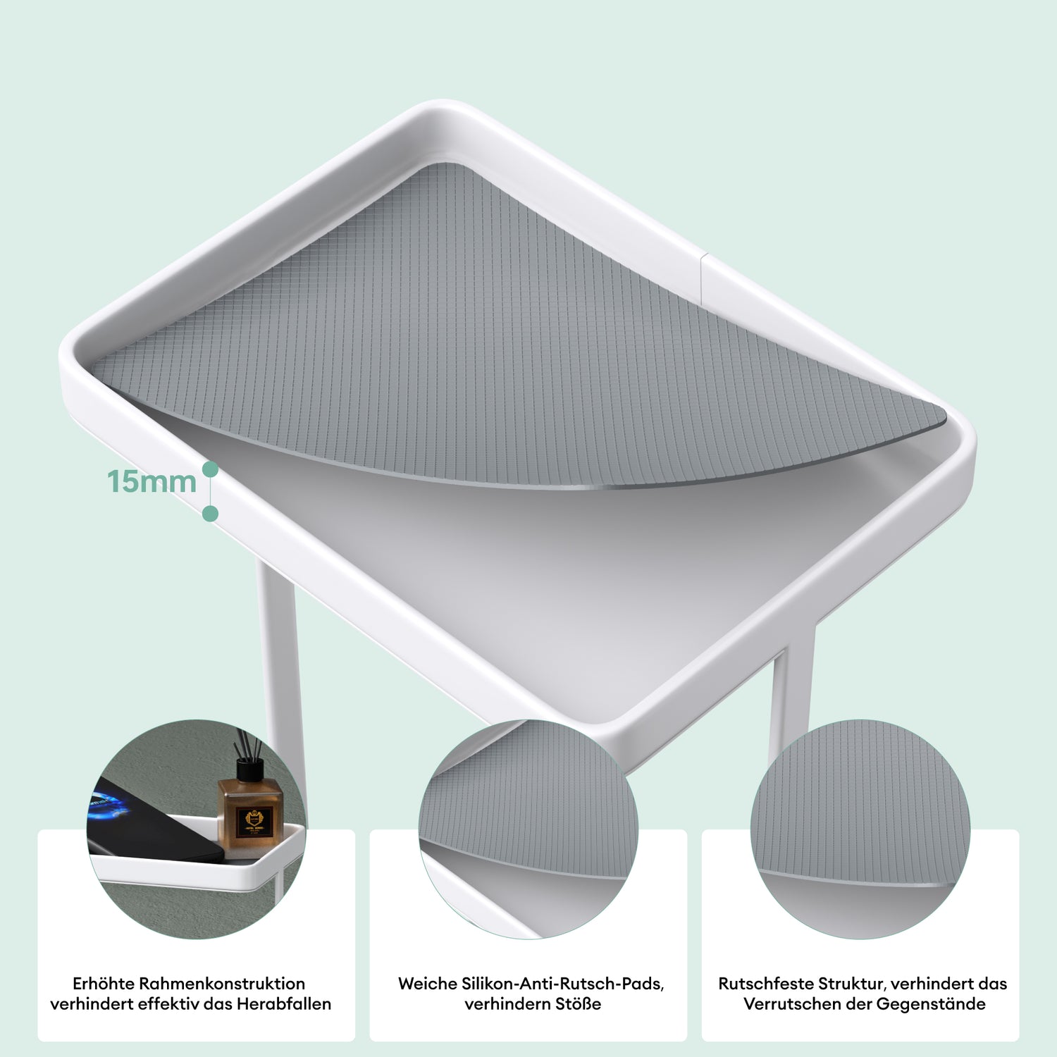 • Praktische Ablage: Integrierter Ablagebereich zur Aufbewahrung von Smartphones oder kleinen Dekorationsgegenständen. Erhöhte Rahmenkonstruktion und rutschfeste Silikonpads verhindern ein Verrutschen der Gegenstände