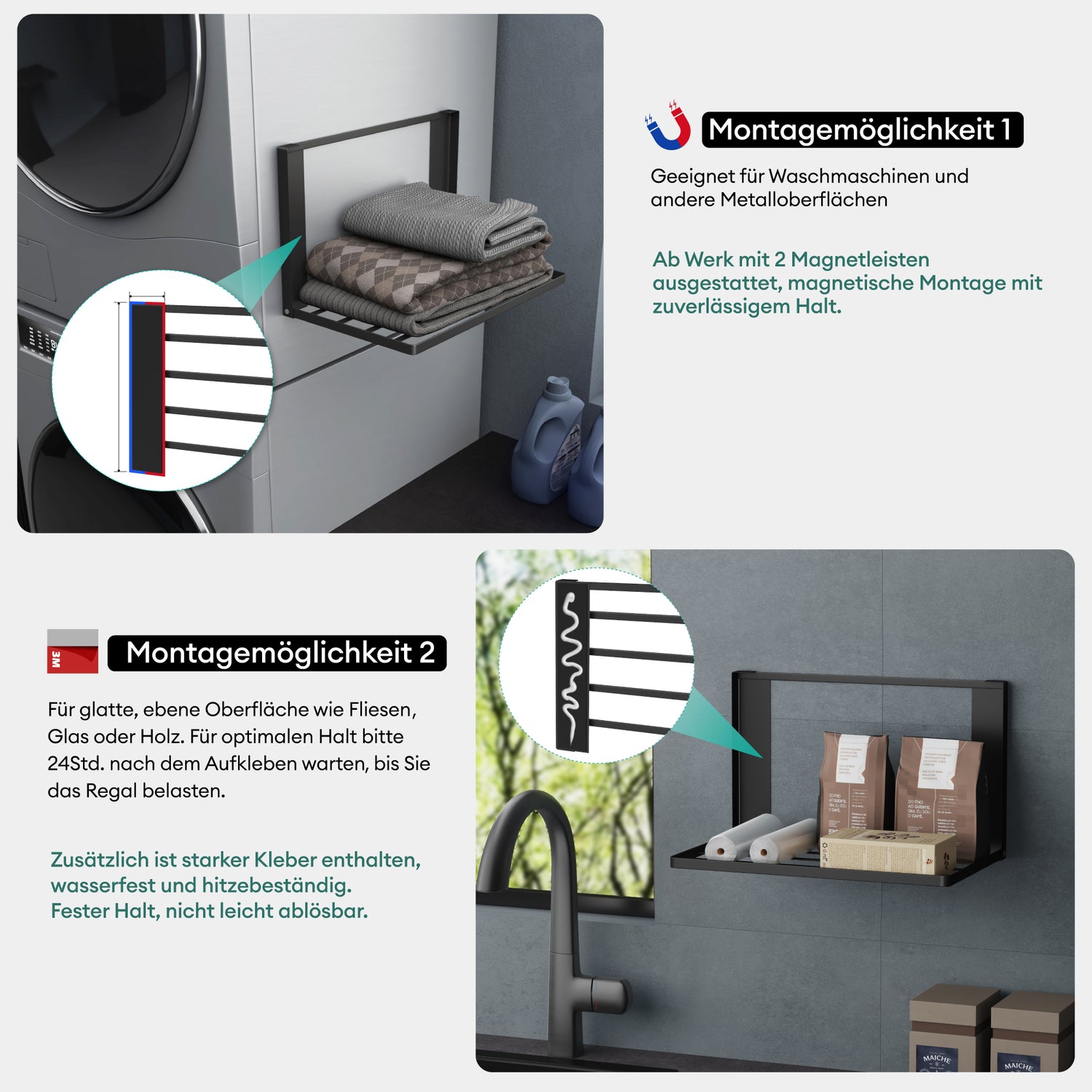 - Zwei Montagearten: Magnetische Befestigung für Waschmaschinen und Eisenoberflächen oder mit rückseitigem Klebstoff für glatte Fliesen, Glas oder Holz – flexibel für verschiedene Wandtypen