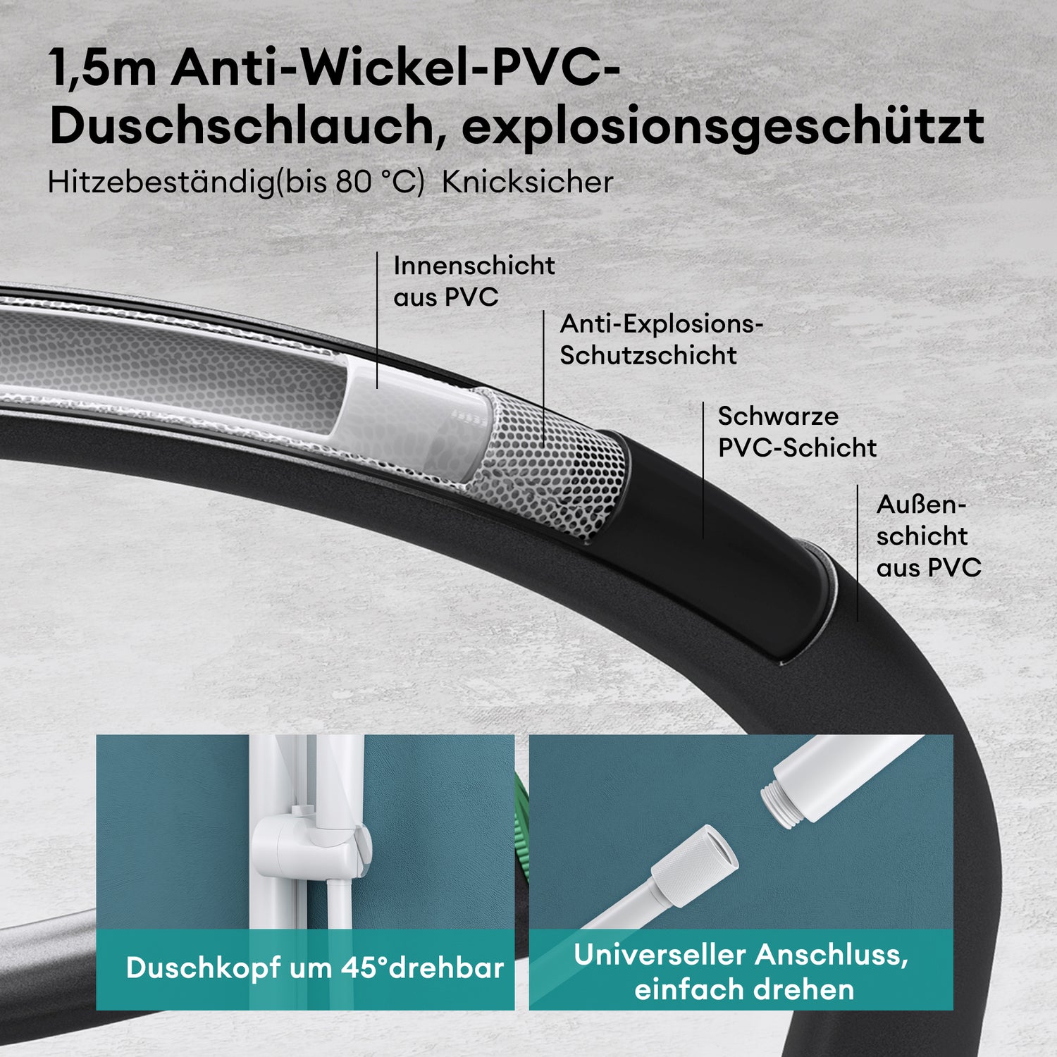 • Flexible de douche anti-torsion : tuyau en PVC de 1,5 m avec conception anti-torsion, résistant à la chaleur jusqu’à 80 °C, montage conforme aux normes DIN.
