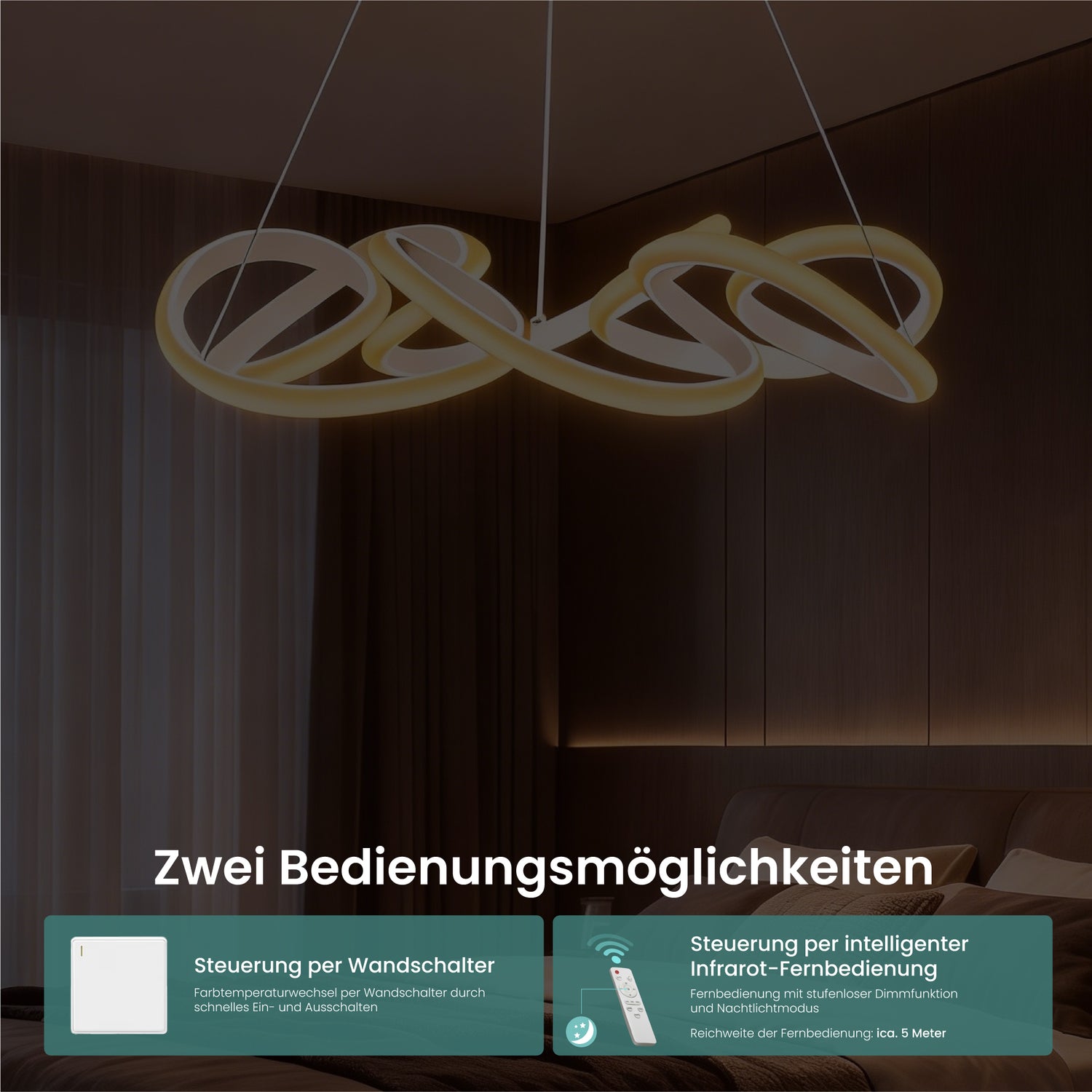 Licht nach Wunsch: Diese dimmbare Pendelleuchte lässt sich stufenlos in Helligkeit und Farbtemperatur von 3000K bis 6400K einstellen. Per Fernbedienung oder App passen Sie das Licht jederzeit Ihrer Stimmung an – ob warmes Licht über dem Esstisch, funktionales Licht in der Küche oder angenehme Beleuchtung im Wohnzimmer.