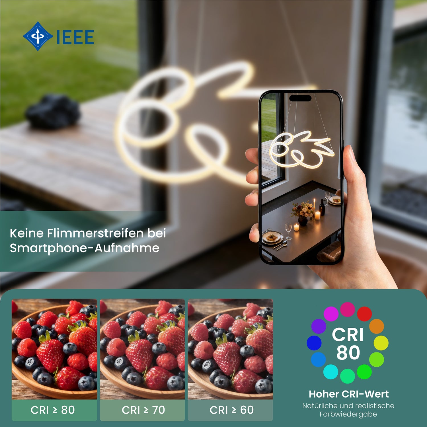 Angenehm & natürlich: Mit 6570 Lumen flimmerfreiem LED-Licht sorgt diese Hängelampe für eine gleichmäßige, augenschonende Ausleuchtung. Der CRI 80 stellt Farben lebendig und natürlich dar – ideal für Essbereiche, Wohnräume und alle Situationen, in denen Licht nicht blenden, sondern unterstützen soll.