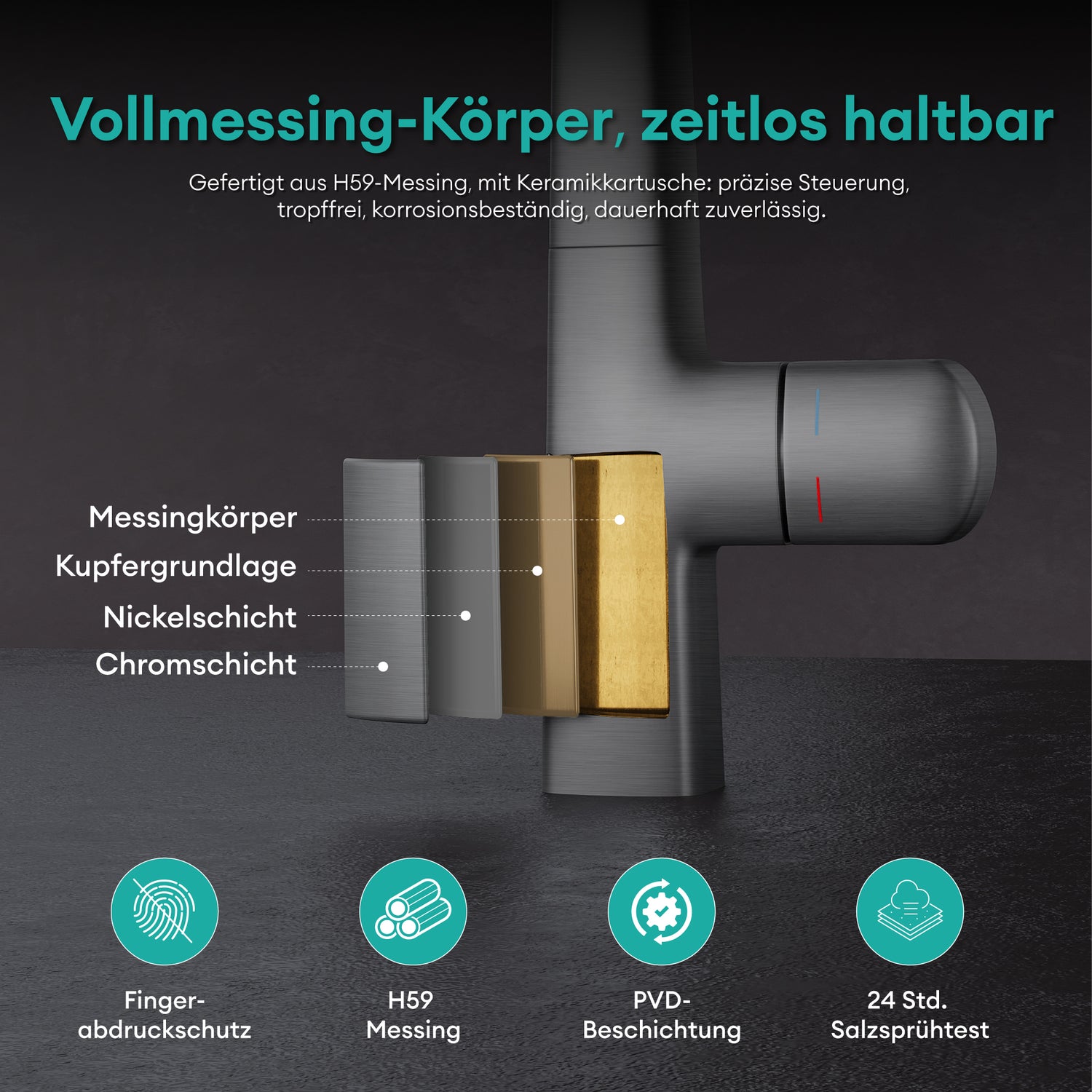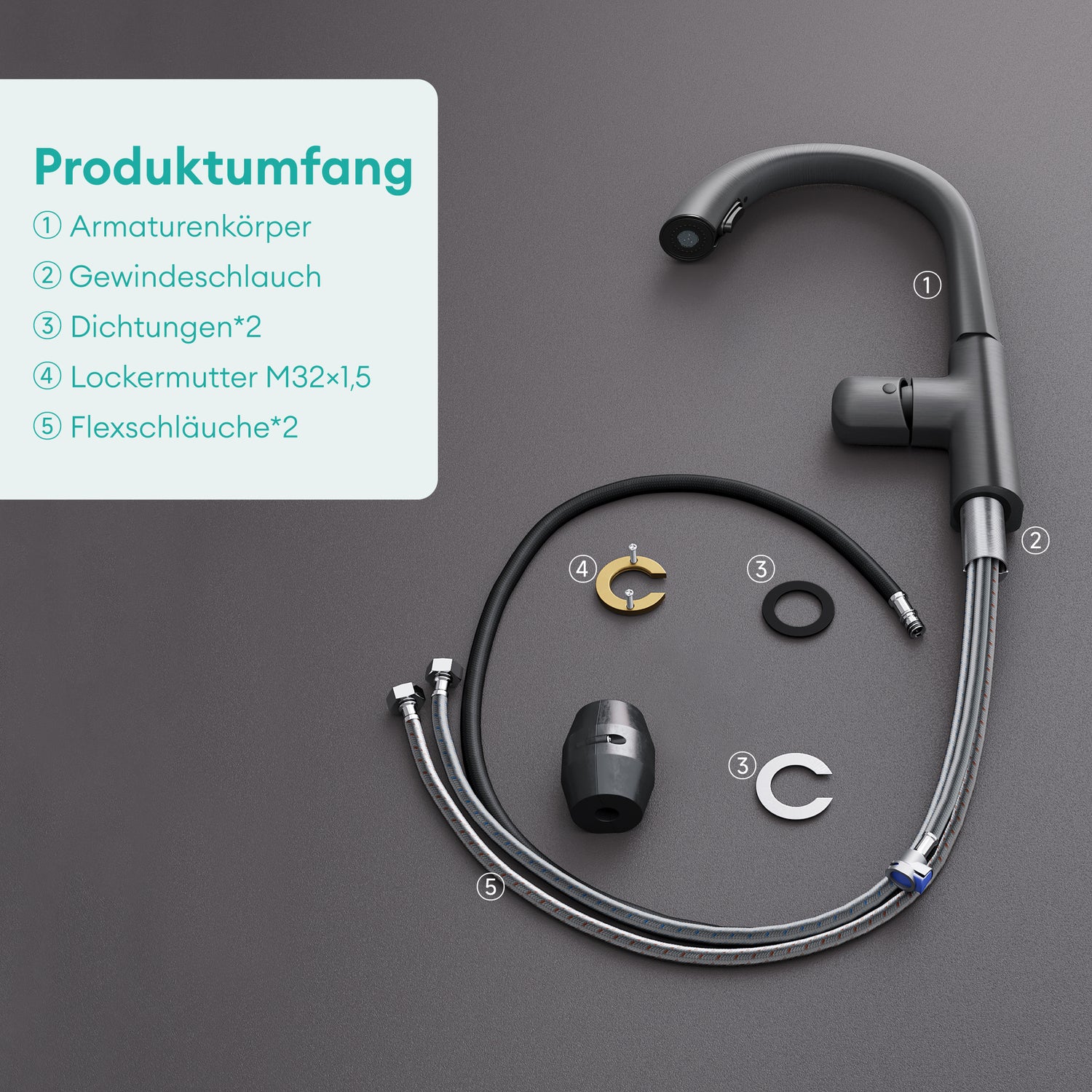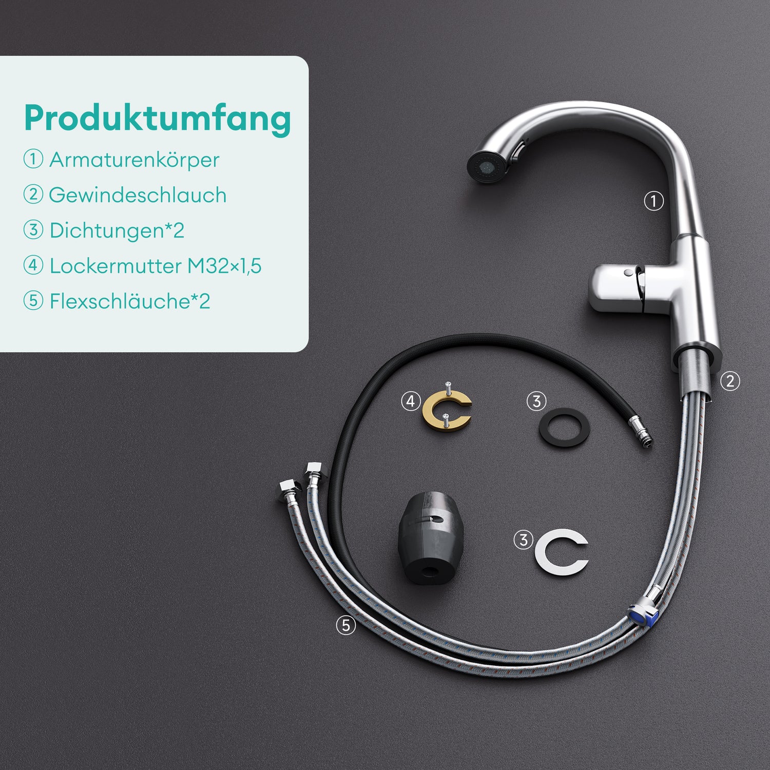 • Instalación sencilla: con dos mangueras flexibles trenzadas de 60 cm, todos los materiales de montaje e instrucciones de instalación para un montaje rápido y sin complicaciones